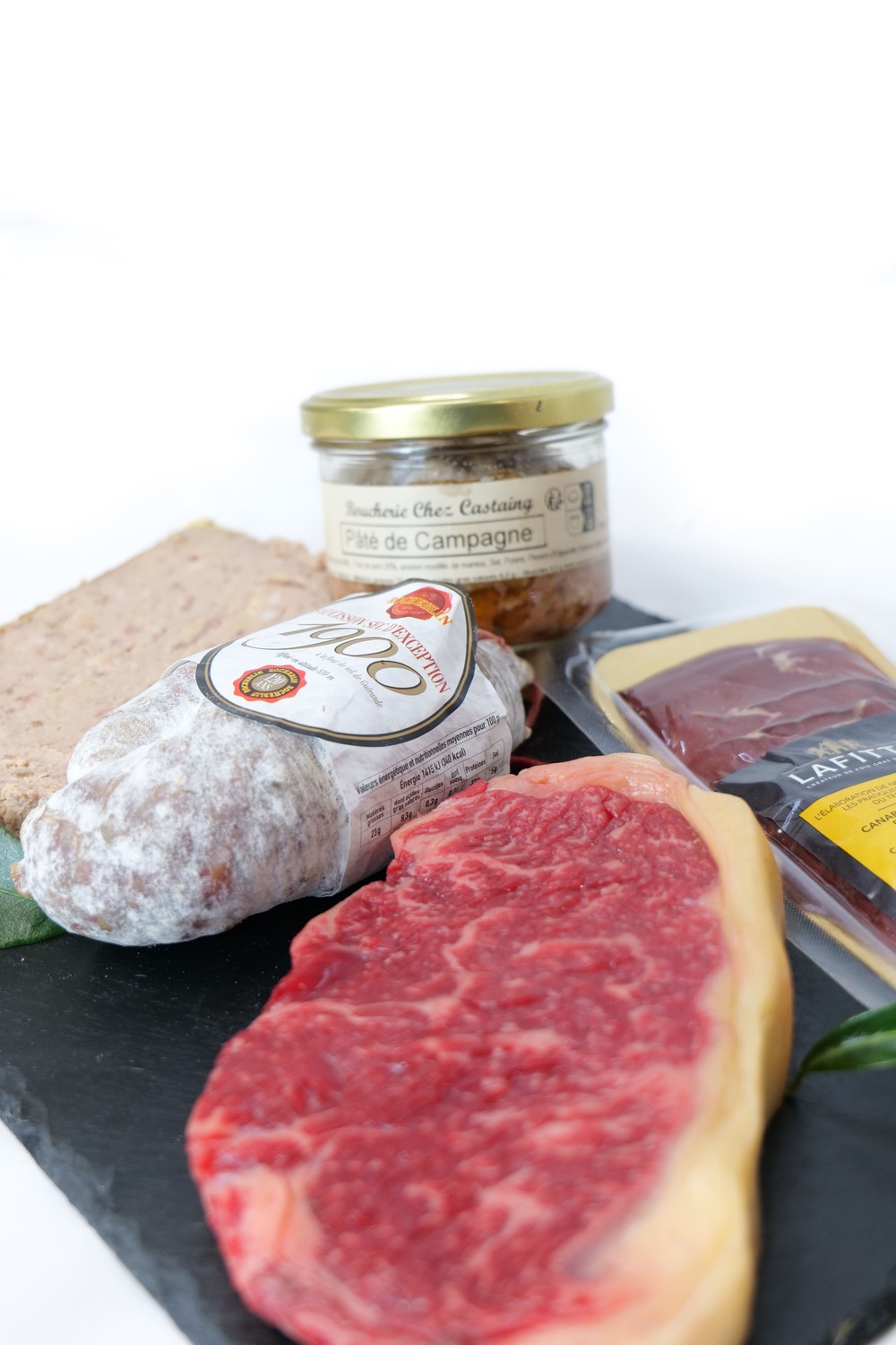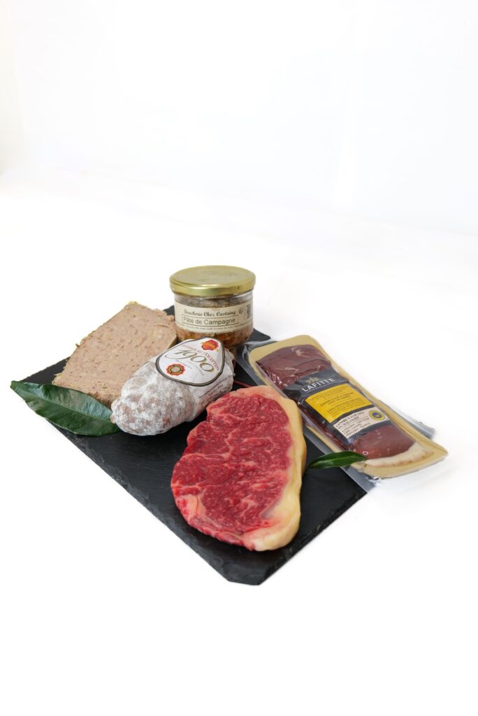 Découvrez notre pack découverte, un assortiment savoureux comprenant du faux filet de race Simmental (500 g), un saucisson sec au sel de Guérande (250 g), une tranche de terrine foie gras girolle (200 g), une planche de magret fumé (100 g) et un pâté de campagne en boîte (180 g). Une sélection exquise pour une expérience gustative inoubliable.