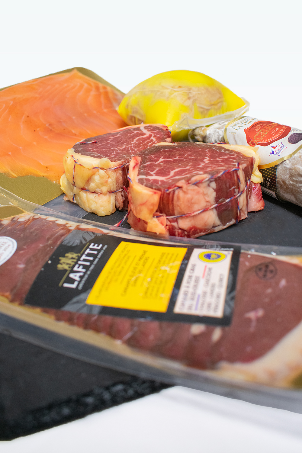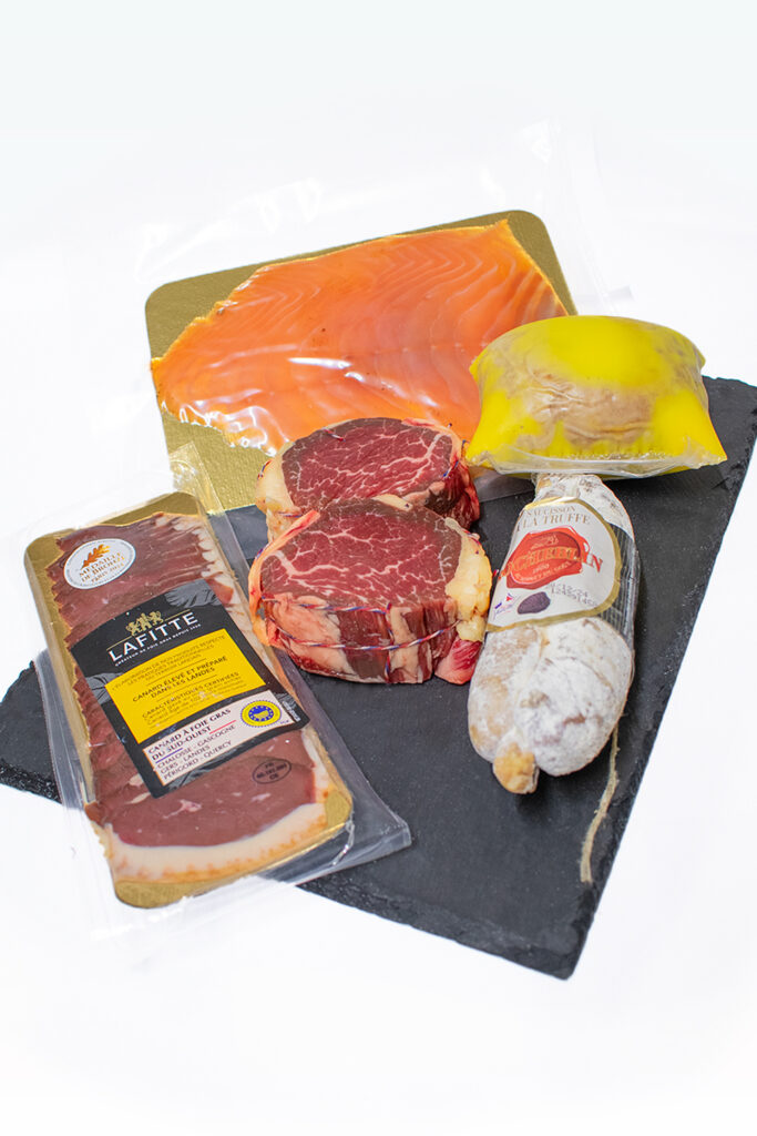 Découvrez notre Pack Festif, un coffret gourmand qui rassemble le meilleur de nos produits. Savourez un magret de canard fumé fondant (100g), un petit foie gras onctueux (230g), 2 tournedos de bœuf Simmental tendres et persillés (180g x 2), du saumon fumé artisanal fait maison (150g) et un saucisson sec à la truffe au parfum délicat (170g). Un assortiment raffiné et généreux !
